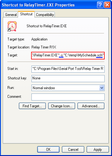 The parameter ”-s” is to launch Relay Timer R1X with the schedule setting file (*.sch). The content of Relay Setting dialog will be loaded. All information will be saved in the default configuration file. When Relay Timer R1X is launched by Icon on desktop or start menu, it loads the default configuration file. When you run this command, you need make sure the current default configuration file is same as when the *.sch file was saved.
