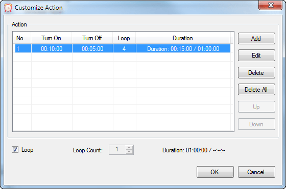 Set Turn On 10 minutes, Turn Off 5 minutes and Loop Count 4.