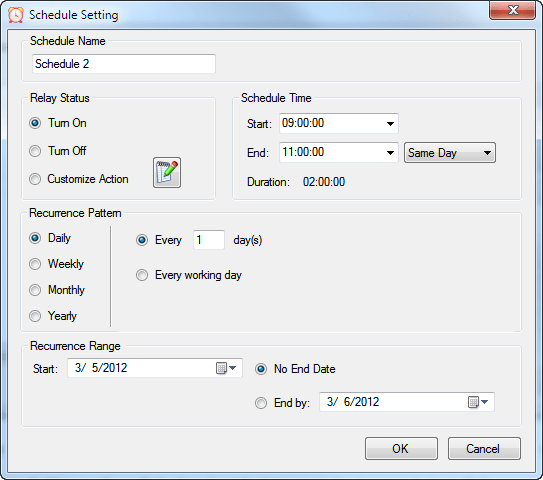 Edit the Schedule Name, select Relay Status, set Schedule Time, select Recurrence Pattern and Range .